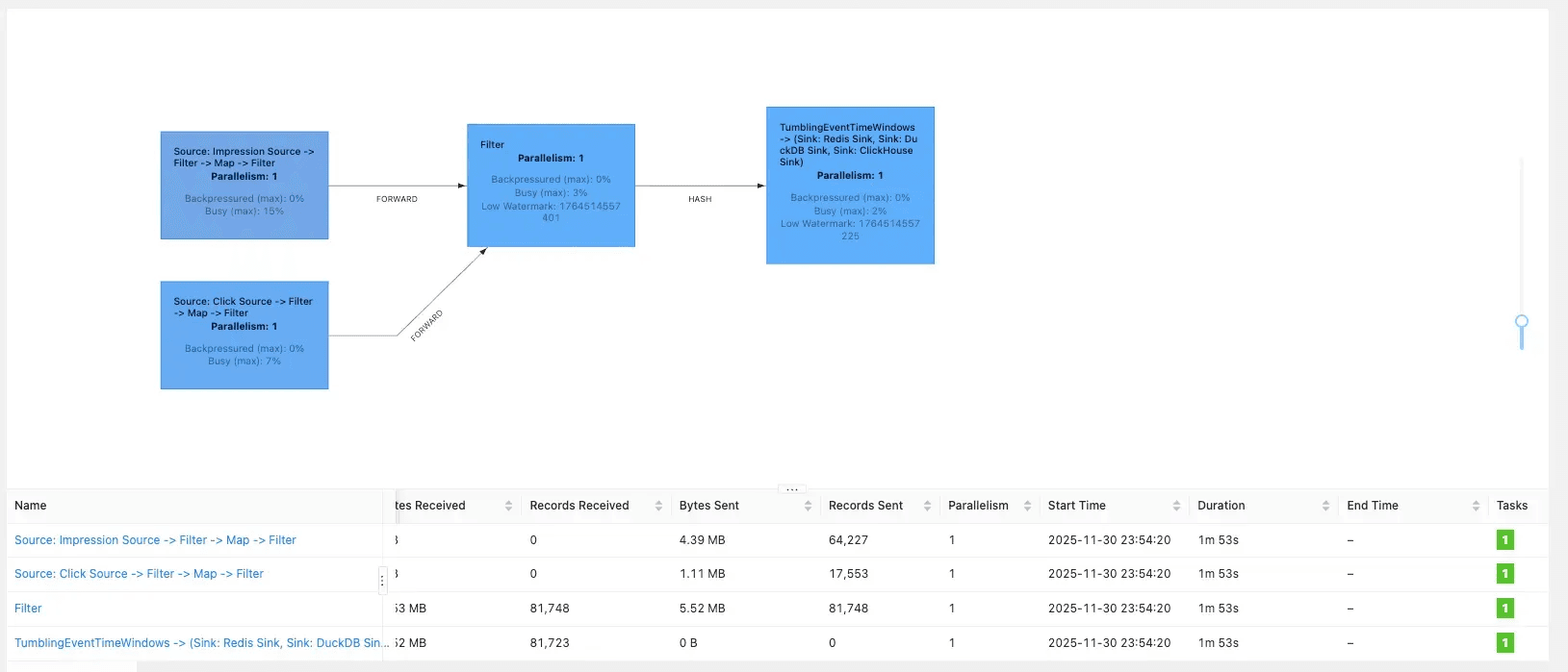 | 45b518fceab4 | flink-taskmanager | 55.83% | 756.4MiB / 3.827GiB | 19.30% | 686MB / 262MB | 175MB / 332MB |