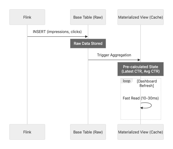 ctr_latest_view: Redis의 Key-Value 조회를 대체. 항상 최신 CTR 상태만 유지 (ReplacingMergeTree).ctr_ml_view: 복잡한 집계 쿼리를 대체. 1분 단위로 미리 합계를 계산해 둠 (AggregatingMergeTree).- 효과: API 서버에서 처리하던